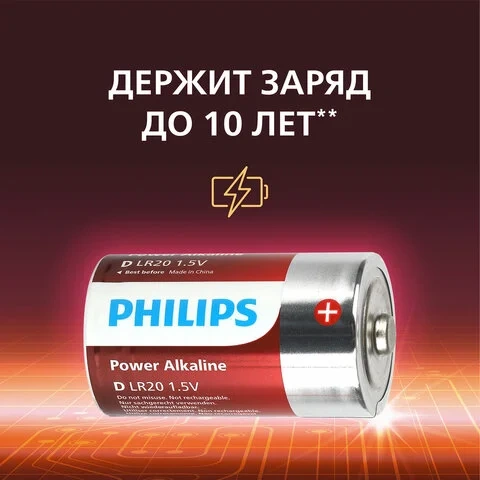 Батарейки алкалиновые КОМПЛЕКТ 2 шт., PHILIPS Power Alkaline, D (LR20, 13А), блистер, Б0062732