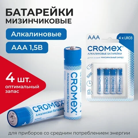 Батарейки алкалиновые 'мизинчиковые' КОМПЛЕКТ 4 шт., CROMEX Alkaline, AAA (LR03, 24А), блистер, 4571
