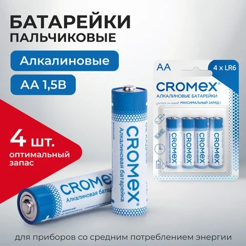 Батарейки алкалиновые 'пальчиковые' КОМПЛЕКТ 4 шт., CROMEX Alkaline, AA (LR6, 15A), блистер, 457130