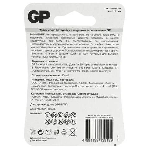 У литиевых батареек GP низкий уровень саморазряда – каждый год хранения она будет терять не более 1% изначальной энергии. Весь срок годности достигает 10 лет.