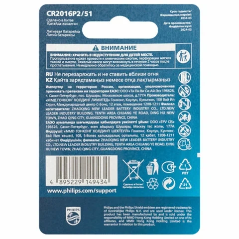 Батарейки литиевые PHILIPS Lithium CR2016, таблетки, дисковые, кнопочные, КОМПЛЕКТ 2 шт., в блистере