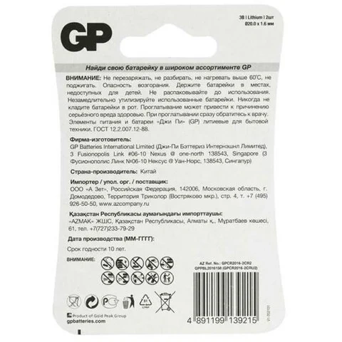 Батарейки КОМПЛЕКТ 2 шт., GP Lithium, CR2016, литиевые, блистер, CR2016-2CRU2