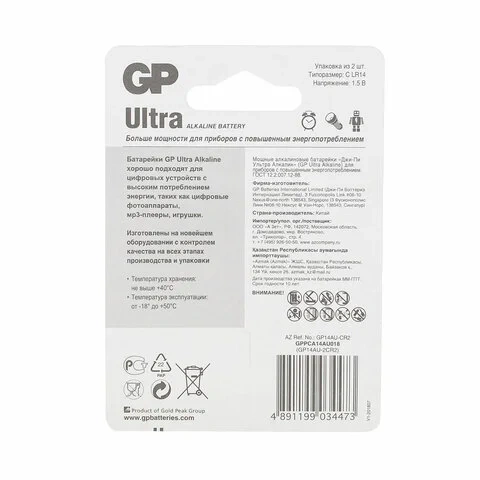 Батарейки GP Ultra, С (LR14, 14 А), алкалиновые, КОМПЛЕКТ 2 шт., блистер, 14AU-2CR2