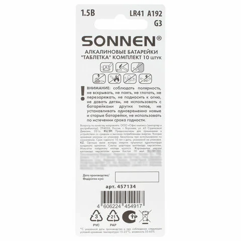 Батарейки алкалиновые 'таблетка' КОМПЛЕКТ 10 шт., SONNEN Alkaline, 192A (G3, LR41), в блистере, 4571