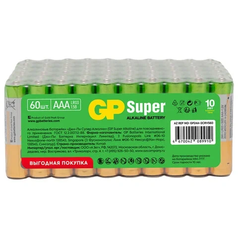 Батарейки GP Super, AAA (LR03, 24А), алкалиновые, мизинчиковые, КОМПЛЕКТ 60 шт., 24A-2CRVS60