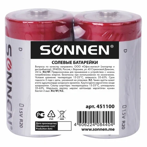 Батарейка Sonnen D R20, 1.5В, солевая, 2шт/уп