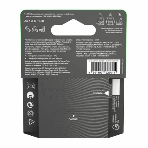 Батарейка Gp Ultra Plus AA LR06, 1.5В, алкалиновая, 4шт/уп