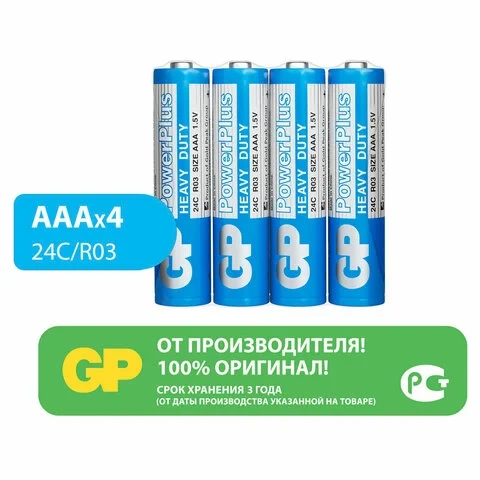 Батарейки КОМПЛЕКТ 4 шт., GP PowerPlus AAA (R03, 24G), солевые, мизинчиковые, в пленке, 24CEBRA-2S4