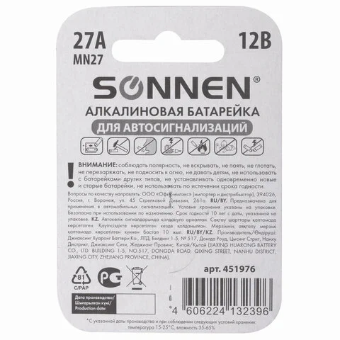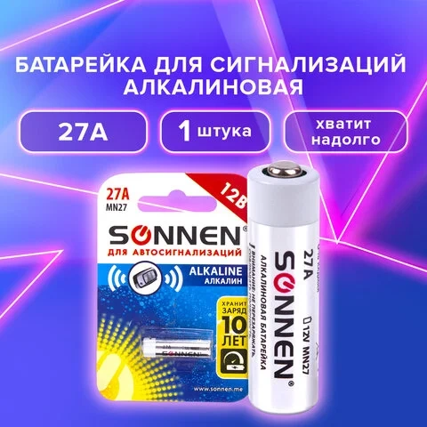 Батарейка Sonnen 27А MN27, 12В, алкалиновая, 1шт/уп