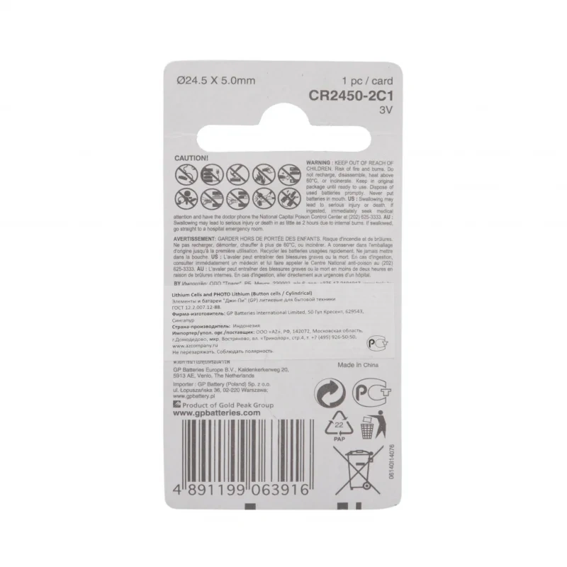 Батарейка литиевая CR2450 1 шт. 'таблетка, дисковая, кнопочная', SONNEN Lithium, в блистере, 455601