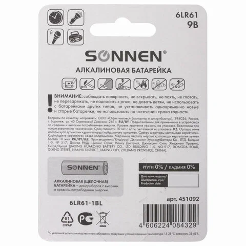 Батарейка Sonnen 6LR61 Крона, 9В, алкалиновая, 1шт
