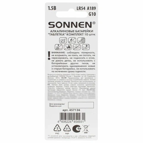 Батарейки алкалиновые 'таблетка' КОМПЛЕКТ 10 шт., SONNEN Alkaline 189A (G10, LR54), в блистере, 4571