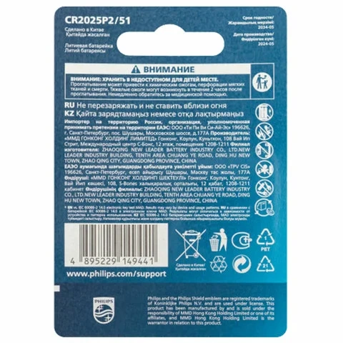 Батарейки литиевые PHILIPS Lithium CR2025, таблетки, дисковые, кнопочные, КОМПЛЕКТ 2 шт., в блистере
