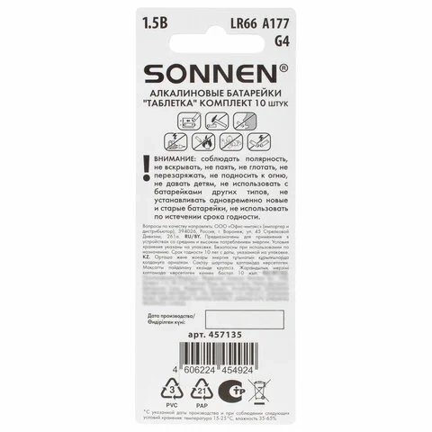 Батарейки алкалиновые 'таблетка' КОМПЛЕКТ 10 шт., SONNEN Alkaline 177A (G4, LR66), в блистере, 45713