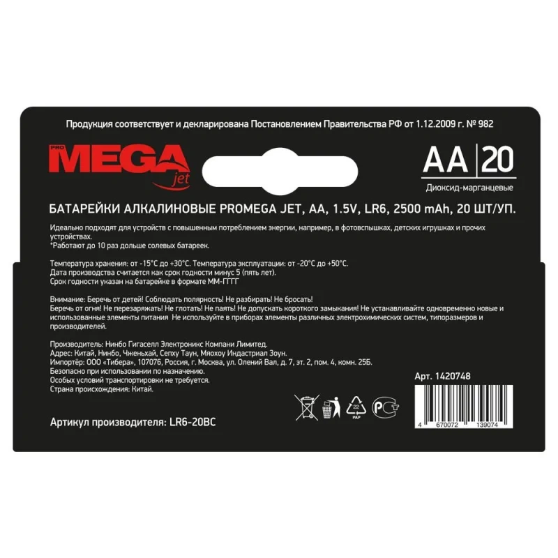 Батарейка Promega Jet AA LR06, 20шт/уп