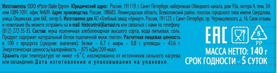 Мука пшеничная хлебопекарная высшего сорта, вода питьевая, сахар, дрожжи хлебопекарные прессованные, масло подсолнечное нерафинированное, соль, комплексная пищевая добавка, мука пшеничная солодовая, антиокислитель Е300, ферментные препараты микробного происхождения, пищевая добавка стабилизатор ацетат кальция.