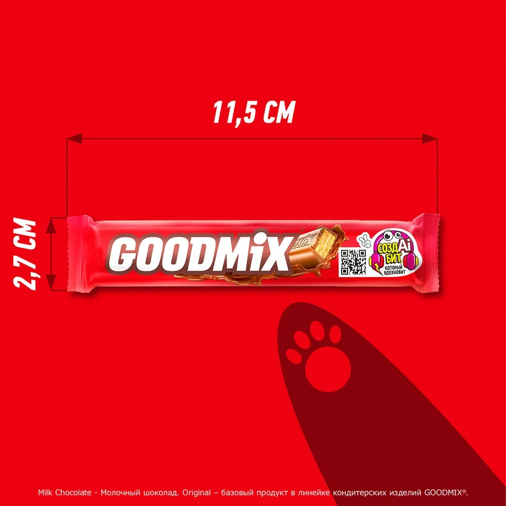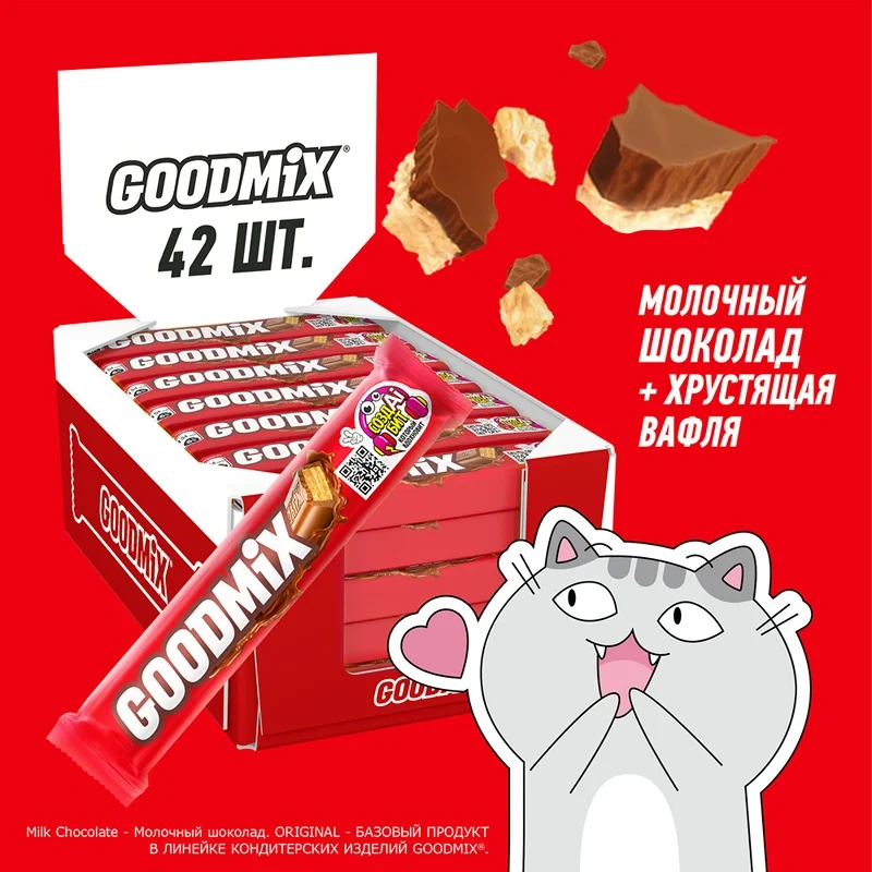 Шоколадный батончик Goodmix Original с молочным шоколадом и с хрустящей вафлей от компании Nestle. Батончик Goodmix Original - это идеальный микс хрустящей вафли и нежного молочного шоколада, дарящий вдохновение и хорошее настроение. Невероятное сочетание молочного шоколада и хрустящей вафли одинаково по душе и взрослым, и маленьким любителям сладостей. Батончик Goodmix - отличный вариант для быстрого утоления голода. Насладитесь вкусным батончиком Goodmix от известного производителя кондитерских изделий. Шоколад от компании Nestle производится без искусственных красителей, ароматизаторов и консервантов. Качество всех исходных ингредиентов тщательно проверяется на соответствие высоким стандартам качества компании.