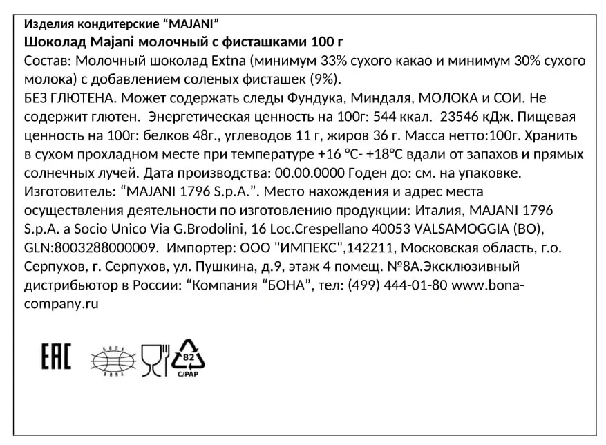 Манго кубики (пюре манго, мальтозный сироп, сахар, стабилизатор Е407, регулятор кислотности (лимонная кислота, яблочная кислота, цитрат натрия), консерванты (сорбат калия, диоксид серы), ароматизатор пищевой манго, пищевые красители: Е171, Е110, Е102), темный шоколад (сахар, какао-тертое, какао-масло, эмульгатор соевый лецитин), ароматизатор ванилин.