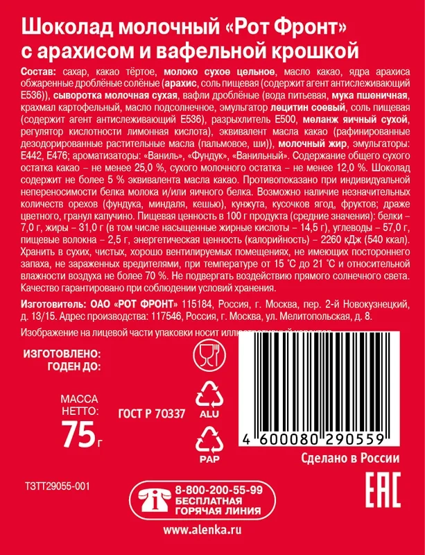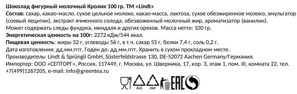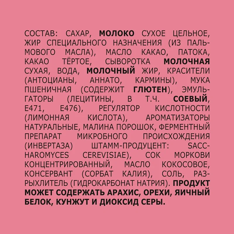Тесто: пшеничная мука, сахар, растительные жиры (пальмовое, ши, кокосовое, подсолнечное), какао-порошок с пониженным содержанием жира, какао-масло, лактоза, эмульгаторы (соевый лецитин, подсолнечный лецитин), разрыхлители (карбонат натрия, карбонат аммония), соль, ароматизаторы (ванилин, натуральный ароматизатор).