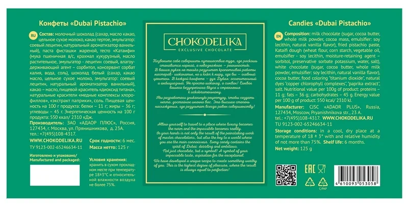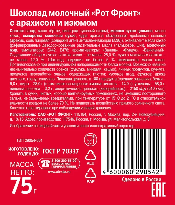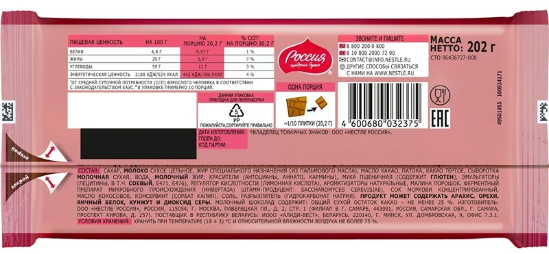 Белый шоколад: сахар, какао-масло, сухое цельное молоко, обезжиренное сухое молоко, молочный жир, эмульгатор соевый лецитин, натуральный ароматизатор ванилин.