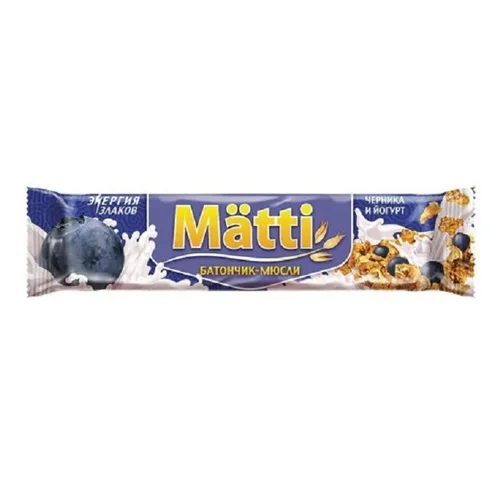Батончики-мюсли Matti Черника и йогурт относятся к новому поколению функциональных продуктов питания и являются хорошим дополнением к ежедневному рациону в качестве источника пищевых волокон, микроэлементов, витаминов. Здоровое питание помогает всегда находиться в прекрасной форме, быть энергичным и подтянутым. Основу батончиков-мюсли составляют овсяные хлопья, имеющие огромную пищевую ценность для организма человека. Овсяные хлопья богаты клетчаткой, витаминами (В1, В2, В6, РР, Е), минеральными веществами (калий, фосфор, железо, натрий, кальций, магний). Черника это низкокалорийная ягода, при этом она богата витаминами и минералами, особенно витамином С, калием и железом. Главное богатство черники это антиоксиданты, черника является хорошим средством для профилактики раковых заболеваний.
