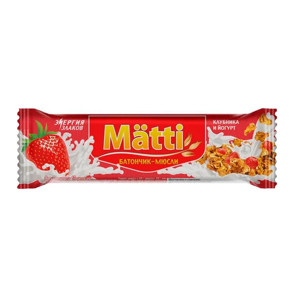 Батончик-мюсли Matti Клубника и йогурт — злаковый батончик с добавлением воздушного риса, ягод и белой глазури.