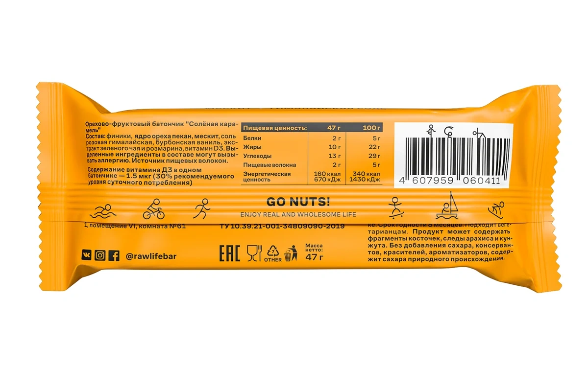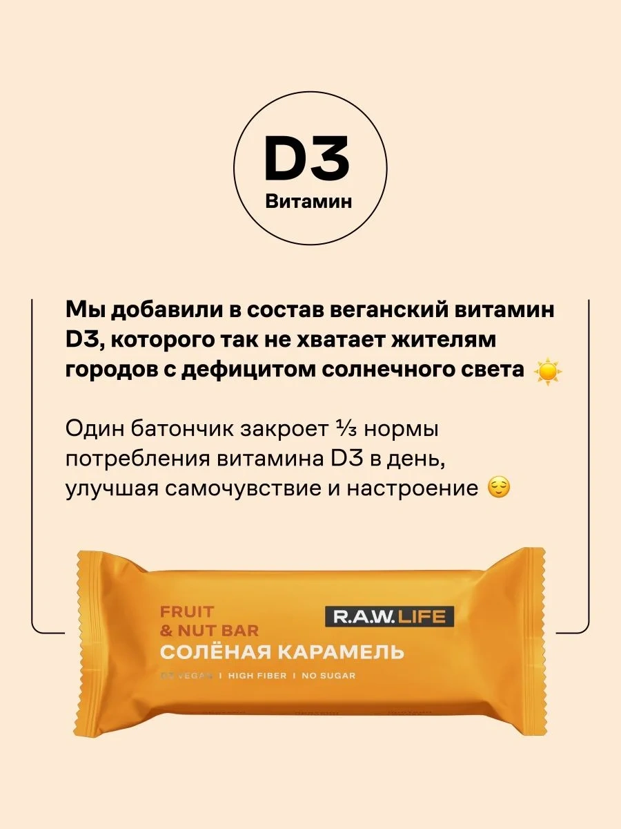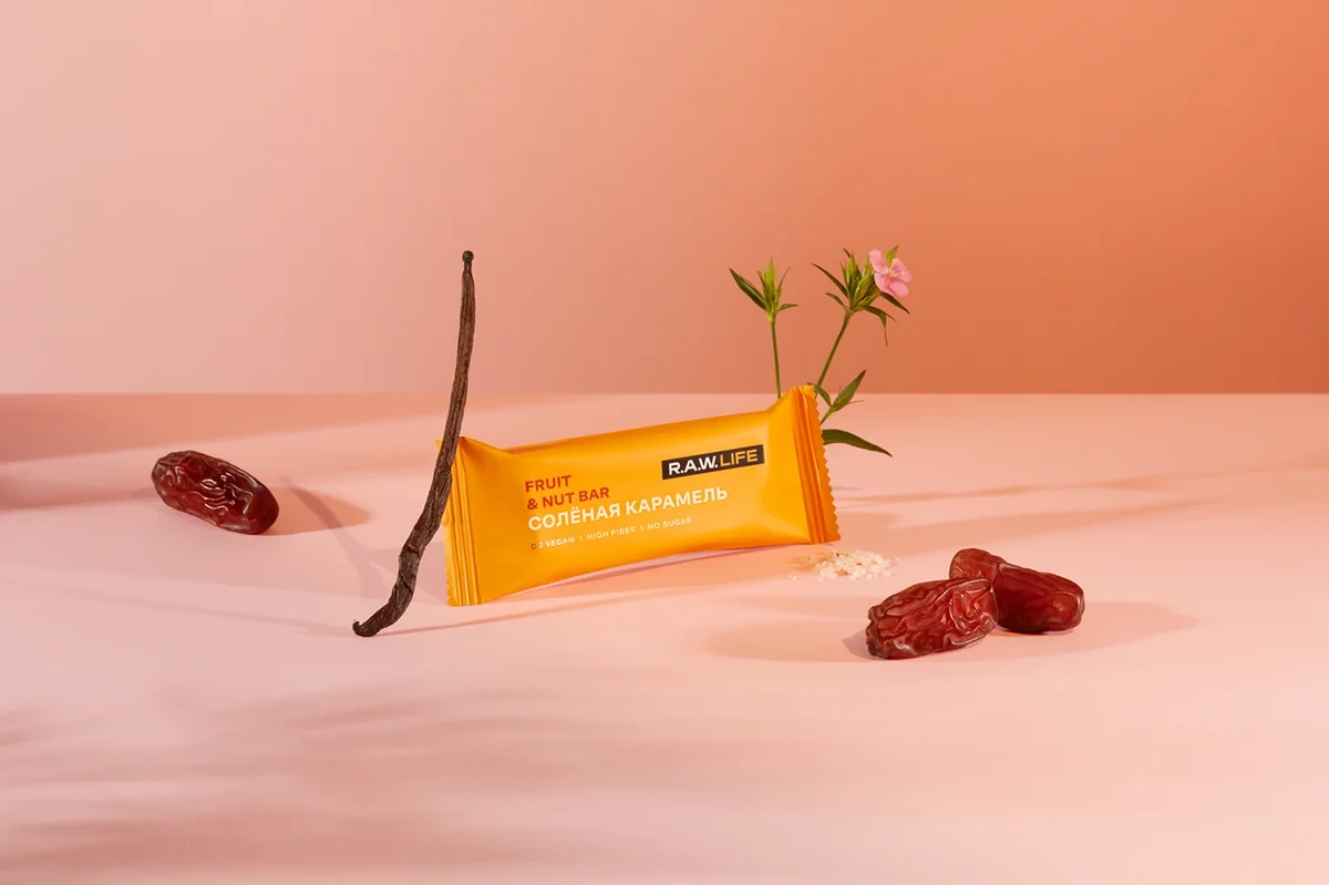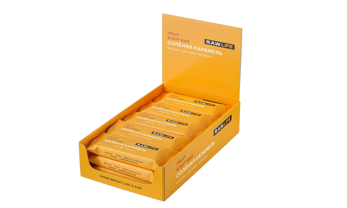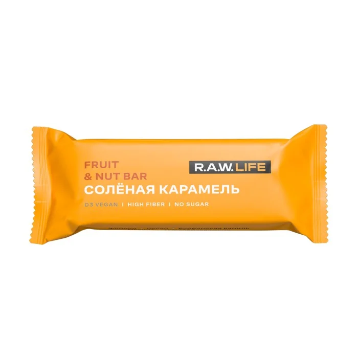 R.A.W. LIFE – натуральные батончики на основе фиников особого сорта и цельных орехов. Все ингредиенты команда R.A.W. LIFE тщательно отбирает со всего мира, используя только качественные продукты. Батончик Соленая карамель — это отличная альтернатива сладостям, которые всегда так хочется. Батончики изготовлены из натуральных и полезных продуктов, богат антиоксидантами. В основе используются финики особого сорта родом из ОАЭ и Саудовской Аравии. Финики высушены прямо на ветках пальмы под лучами южного солнца. Поэтому у них такой легкий карамельный вкус.