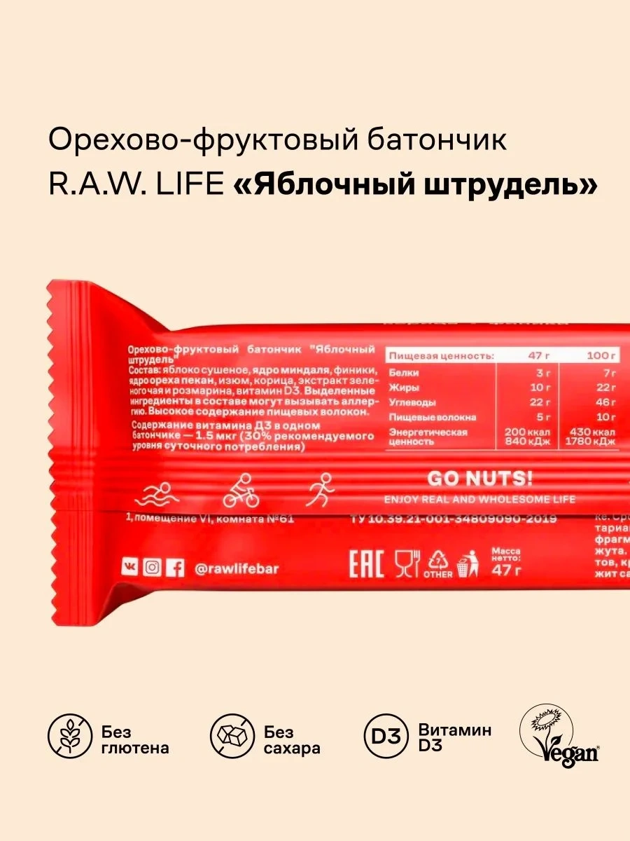 Батончик R.A.W. LIFE орехово-фруктовый Яблочный штрудель, 47г