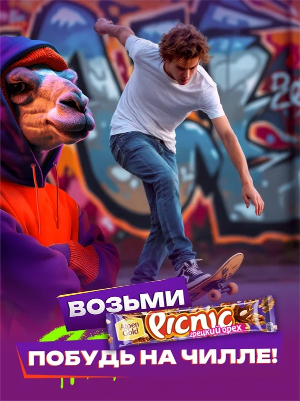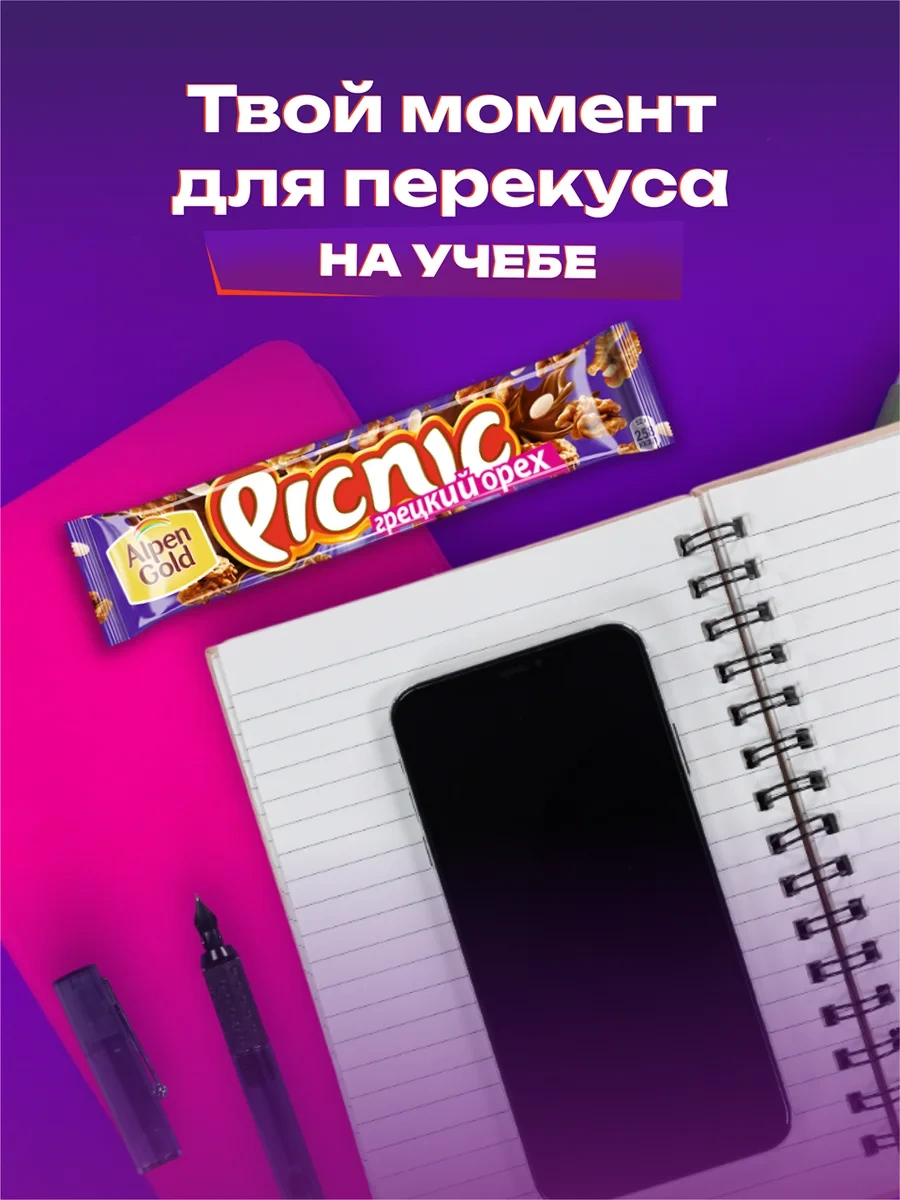 «Picnic» — это микс вкусов, который позволяет наслаждаться жизнью и кайфовать в любой момент. Сочетание хрустящей вафли, арахиса, изюма и карамели дарит истинное удовольствие, а добавление мягкого и нежного шоколада делает вкус еще более незабываемым. Прогулки в парке и пикники с друзьями заиграют новыми красками с ярким вкусом шоколадного батончика «Picnic». Открой для себя новые ощущения и кайфуй с уникальным вкусом. «Picnic» — лучший выбор для всех, кто умеет получать кайф от жизни. Шоколадный батончик Picnic с грецким орехом — это уникальное сочетание изысканного вкуса и питательности. Яркий взрывной и насыщенный вкус — то, что нужно для энергичного перекуса. Хрустящие вафли, мягкая карамель и воздушный рис дополняются грецким орехом и арахисом, которые добавляют батончику кайфа. Нежнейший молочный шоколад приятно тает во рту, раскрывая вкус на полную катушку. Шоколадка Picnic — заряд энергии всегда с собой! Состав: молочный шоколад 38% (сахар, какао-масло, молоко сухое цельное, какао тертое, сухая молочная сыворотка, молочный жир, эмульгаторы (соевый лецитин, Е476), ароматизатор ванилин), сахар, масло пальмовое, грецкий орех обжаренный дробленый (7%), воздушный рис (6,6%) (мука рисовая, сахар, ячменно-солодовый экстракт, масло пальмовое, соль), мука пшеничная, патока карамельная (кукурузная), арахис обжаренный дробленый (3,3%), сыворотка сухая молочная, какао-порошок, соль, эмульгаторы (Е471, лецитин соевый, масло соевое, ароматизатор натуральный грецкий орех и ароматизатор ванилин. Конфета содержит грецкий орех, арахис, пшеницу, глютен, молочные продукты, соевые продукты, может содержать следы других орехов. Вес: 52 г. Тип упаковки: флоу-пак. Страна производства: Россия. Срок хранения: 9 месяцев. ТУ 9123-002-45257475.