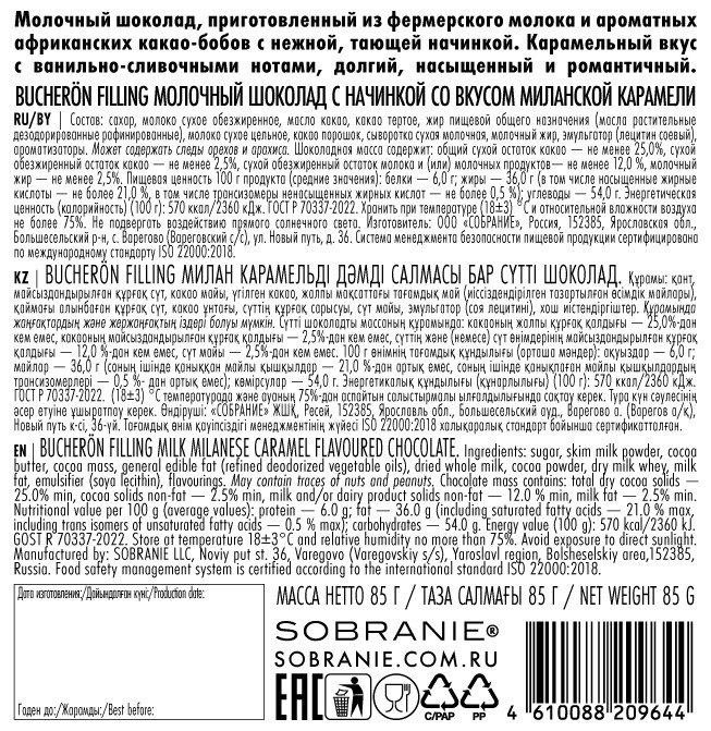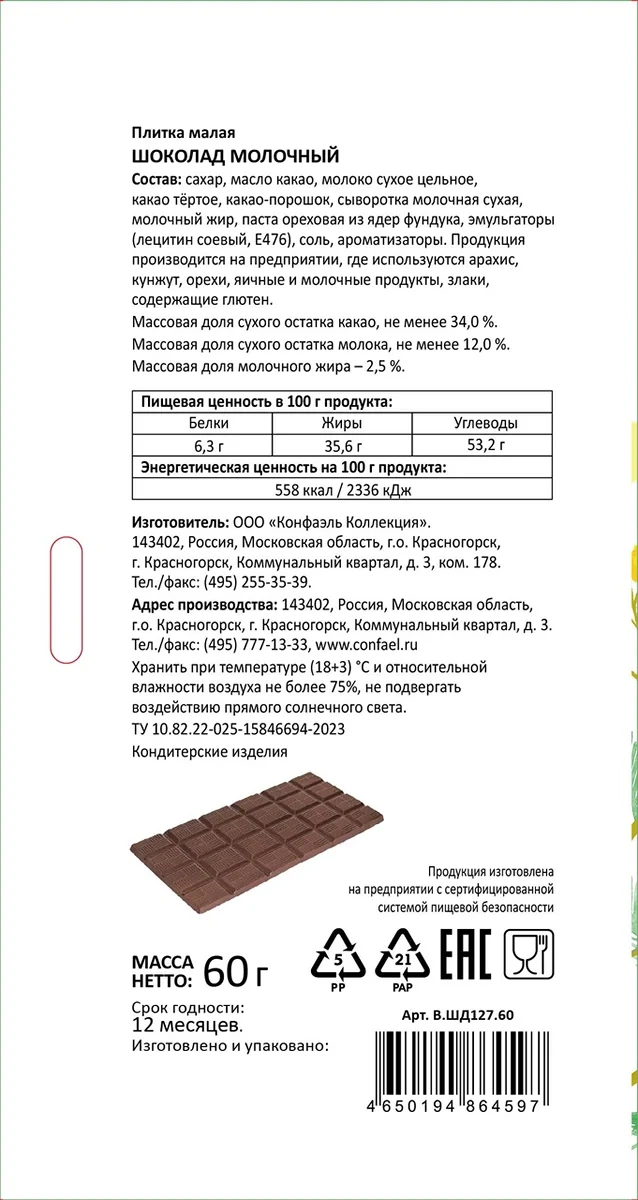 Сахар, эквивалент масло какао (масло ши, масло рапсовое), сухое цельное молоко, сухое молоко обезжиренное, какао тертое, какао порошок натуральный, глюкозный сироп (кукурузный), заменитель молочного жира (масло пальмовое рафинированное дезодорированное), сорбитовый сироп, мука пшеничная, арахис, крахмал картофельный, эмульгатор (соевый лецитин), соль пищевая, сода пищевая, ароматизатор ванилин.