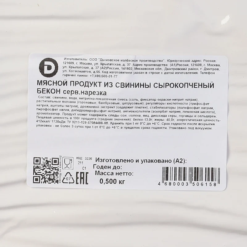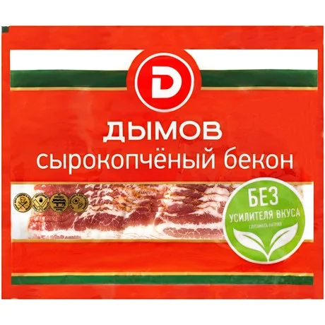 Бекон Венгерский ДЫМОВ – прекрасная основа для многих блюд и создания вкуснейших закусок.Необычайно нежный бекон с приятным пряным вкусом и аппетитным ароматом изготовлен из отборного свиного мяса. Благодаря копчению в особых условиях, мясо сохранило все свои положительные качества. Продукт уже готов к употреблению.Бекон выпускается компанией ДЫМОВ в вакуумной упаковке. Благодаря ей, деликатес дольше остается свежим.Покупайте бекон Венгерский ДЫМОВ, 500г в Санкт-Петербурге.Состав: свинина, вода, соль поваренная пищевая, сахар, усилитель вкуса и аромата (глутамат натрия, рибонуклеотид натрия), стабилизаторы (фосфат натрия, дигидропирофосфат натрия), животный белок, ароматизатор (свинина), регулятор кислотности (карбонаты натрия), антиокислители (аскорбат и изоаскорбат натрия), консервант (нитрит калия), фиксатор окраски (нитрит натрия).Пищевая ценность на 100г продукта: белки 10,0г, жиры 44,0г.Энергетическая ценность: 436 ккал.Условия хранения: хранить при температуре от 0 до +6'С.Срок годности: 90 суток.