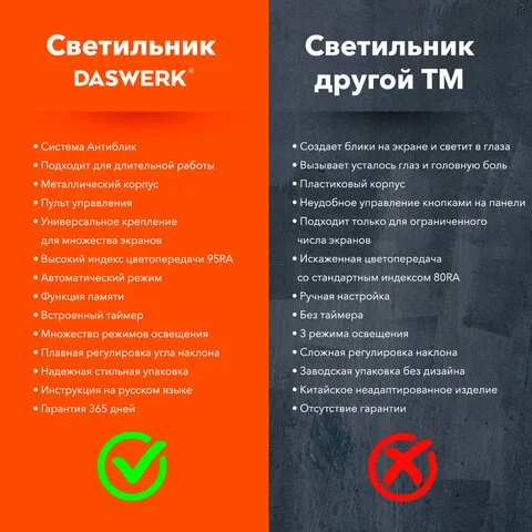 Специально разработанный ассиметричный источник света обеспечивает освещение широкой рабочей зоны без мерцания и пульсации. Направленный свет лампы DASWERK не вызывает усталость и не создает дискомфорт даже при длительной работе.