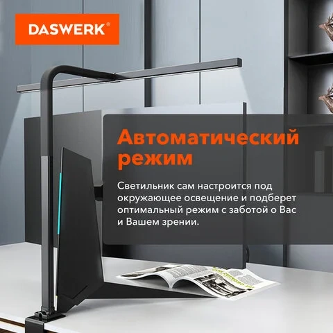 Бестеневая лампа светильник на струбцине, LED, 16 Вт, черный, высота 75 см, DASWERK, 238331