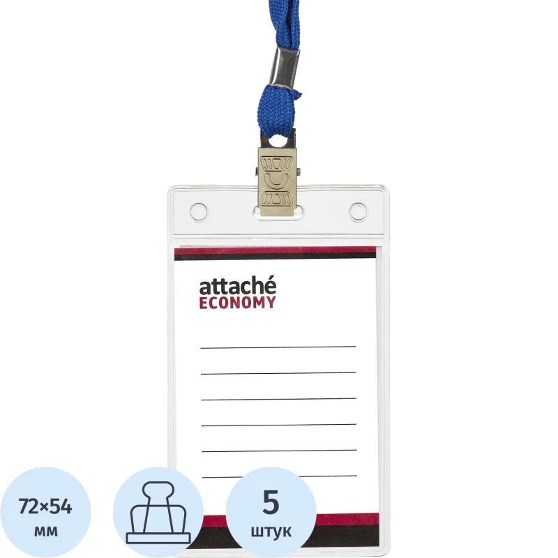 Бейдж Attache (Attache Economy) вертикальный 90×60 мм с зажимом и синей тесьмой (5 штук в упаковке, размер вкладыша: 72×54 мм)