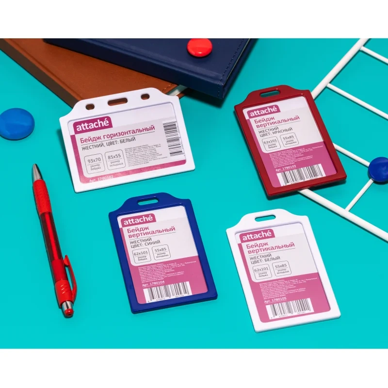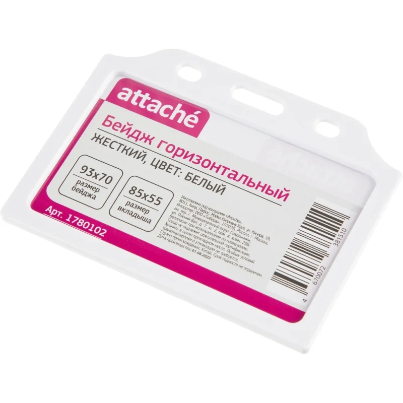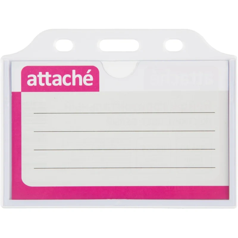 Двусторонний бейдж Attache горизонтальный, белый выполнен из жесткого пластика. Размер вкладыша — 85×55 мм. Размер бейджа 93×70 мм. Предназначен для использования на семинарах, конференциях, выставках и прочих мероприятиях. Страна производитель: Китай. На оборотной стороне карточки-вкладыша разлинованное поле.
