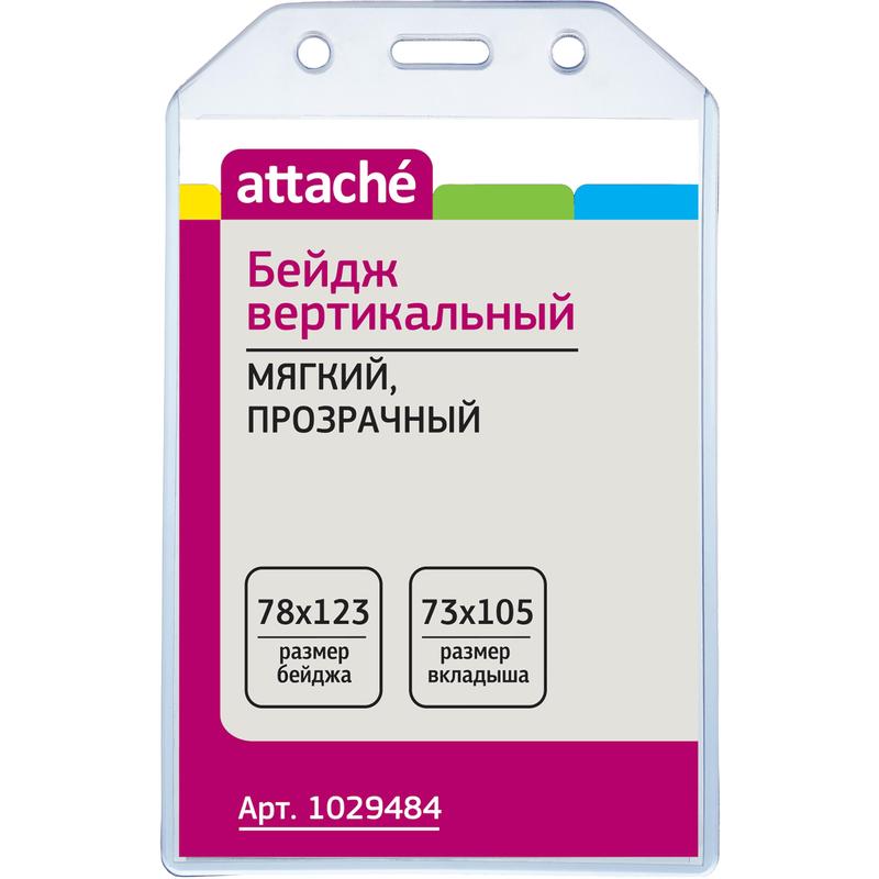 Бейдж Attache вертикальный, прозрачный, выполнен из мягкого пластика. Размер бейджа — 78?123 мм, размер вкладыша — 73?105 мм. Подходит для ношения именных карточек и пропусков на держателе с рулеткой или тесьмой. Предназначен для использования на семинарах, конференциях, выставках и других мероприятиях. Поставляется в упаковке по 10 штук.