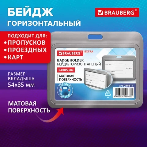 Бейдж горизонтальный (54х85 мм), серый, МАТОВАЯ ПОВЕРХНОСТЬ, BRAUBERG EXTRA, 238817