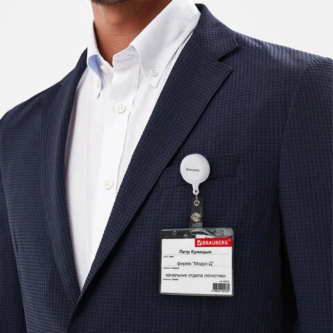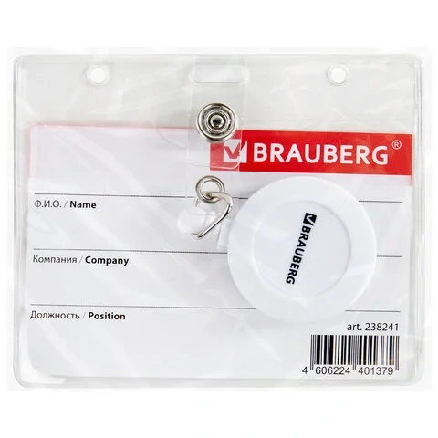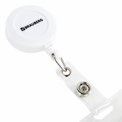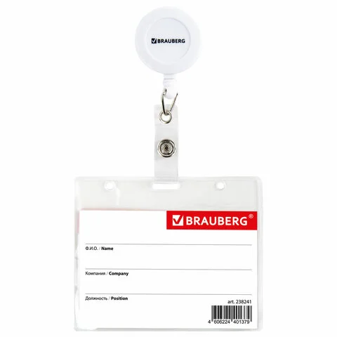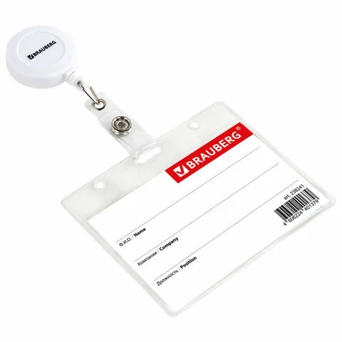 Бейдж горизонтальный (60х90 мм), с держателем-рулеткой 70 см, белый, BRAUBERG, 238241