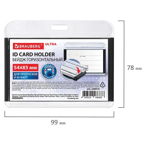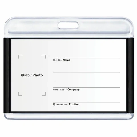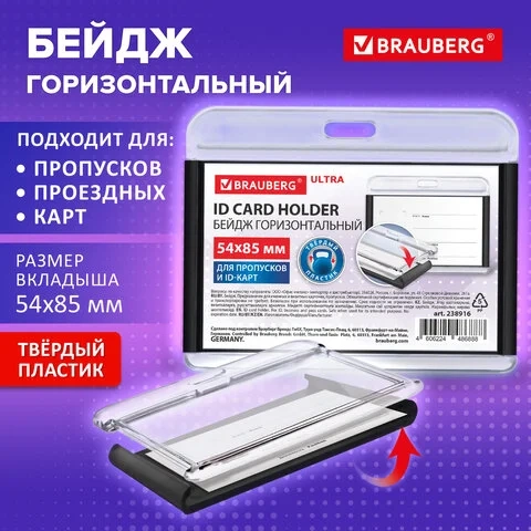 Бейдж горизонтальный для пропуска и ID-карт, 54х85 мм, черный, BRAUBERG ULTRA, 238916