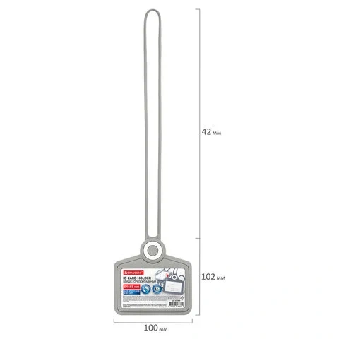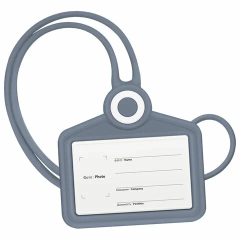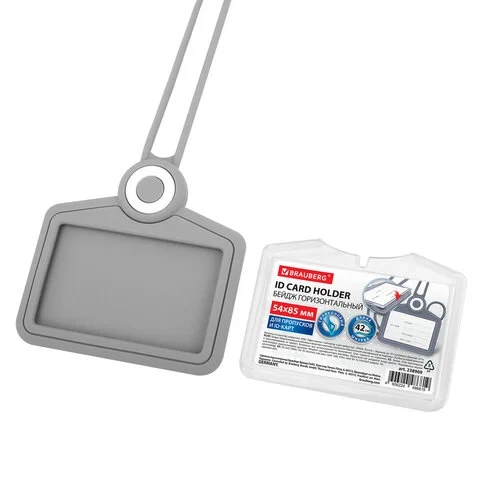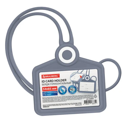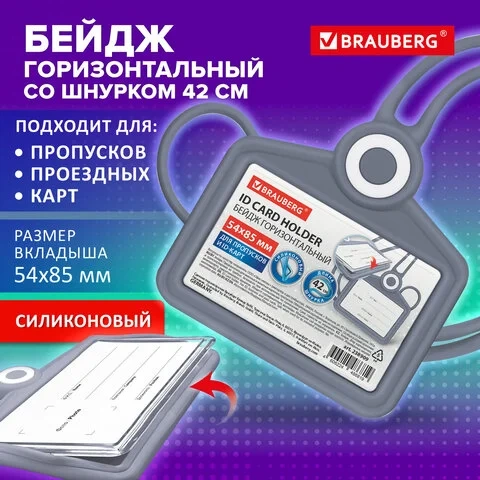 Бейдж горизонтальный для пропуска и ID-карт, СИЛИКОНОВЫЙ, 54х85 мм, шнурок 42 см, серый, BRAUBERG, 2