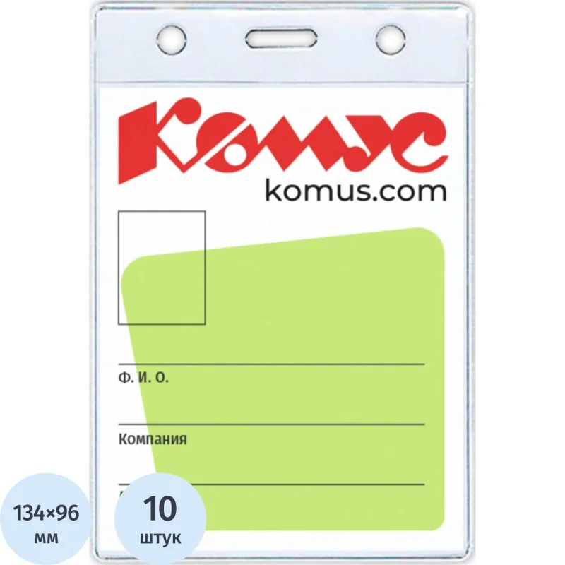 Бейдж 'Комус' вертикальный, изготовлен из прозрачного пластика. Размер бейджика - 102x155 мм. Размер вкладыша - 96x134 мм. Допуск по размерам 1/+1,5 мм. В качестве крепежного элемента может использоваться ретрактор, лента с клипсой, клипса с булавкой, шнур, карабин. Для крепления имеет одно овальное (длина 14 мм) и 2 круглых (диаметр 6 мм) отверстия. Подходит для ношения именных карточек и пропусков. Поставляется в упаковке в количестве 10 штук.