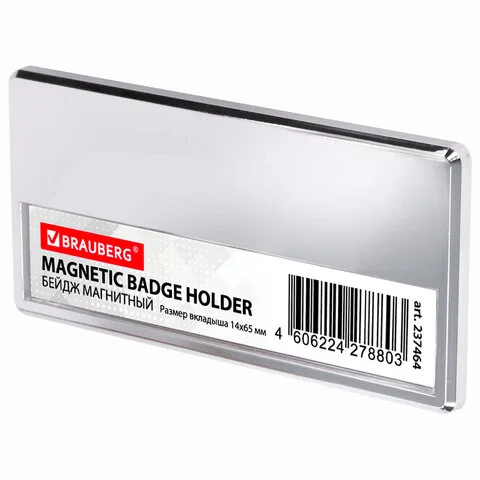 Бейдж магнитный серебристый 34х70 мм с окошком 14х65 мм, BRAUBERG, 237464