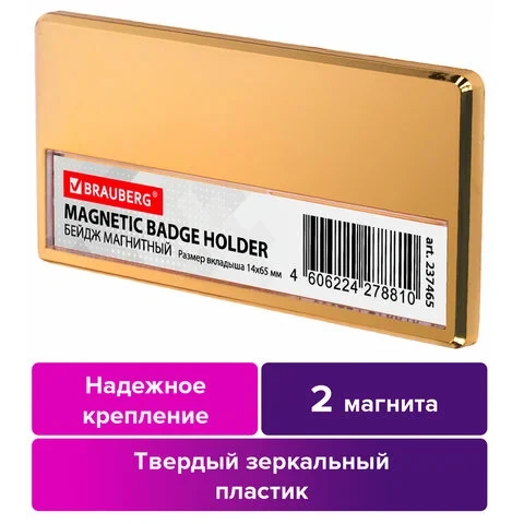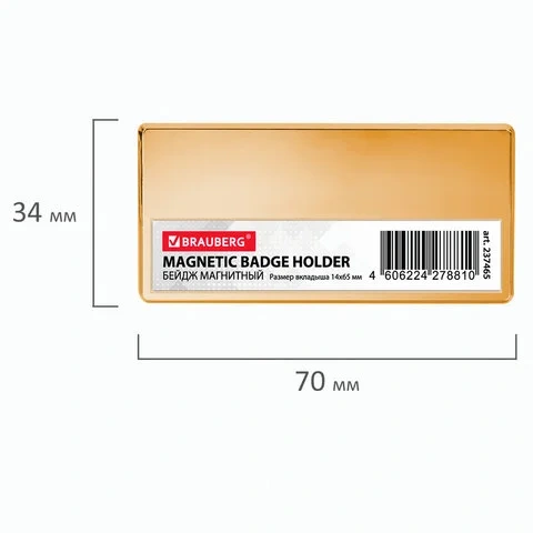 Бейдж магнитный золотистый 34х70 мм с окошком 14х65 мм, BRAUBERG, 237465