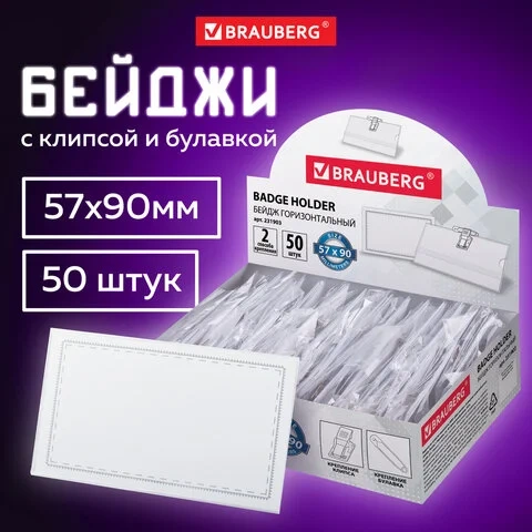 Бейдж на зажиме с булавкой Brauberg 57х90мм, 50шт/уп
