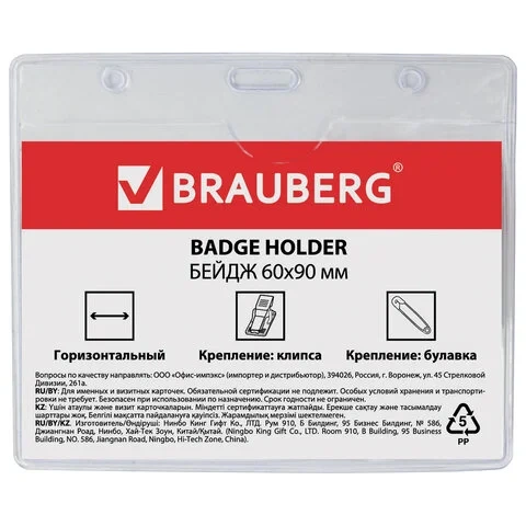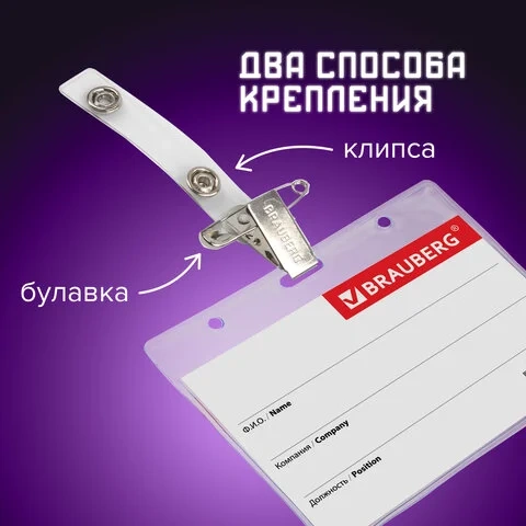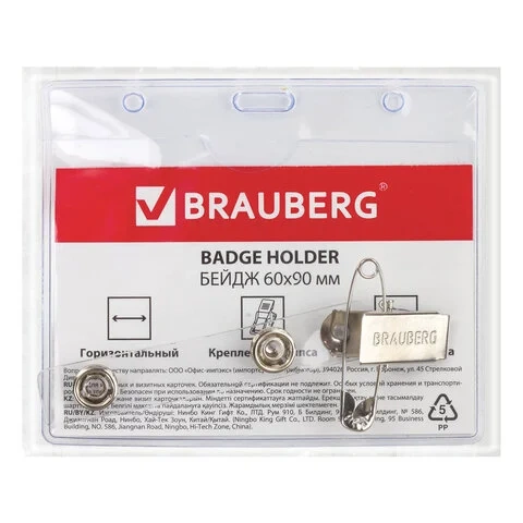 Бейдж на зажиме с булавкой Brauberg 60х90мм