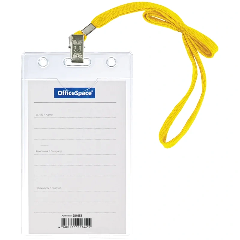 Бейдж вертикальный из мягкого прочного пластика. Съемный текстильный шнурок крепится к бейджу с помощью металлической клипсы. Цвет шнурка - желтый. В комплект входит вкладыш с полями для персональных данных. Подходит для пропуска, визитки, именной карточки.