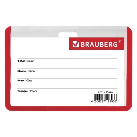 Бейдж с тесьмой Brauberg для школьников 55х90мм, красная тесьма, на клип-замке с петелькой