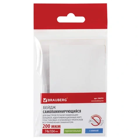 Бейдж самоламинирующийся горизонтальный (74х104 мм), 200 мкм, с клипсой, BRAUBERG, 236791
