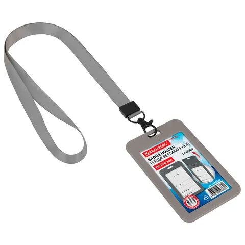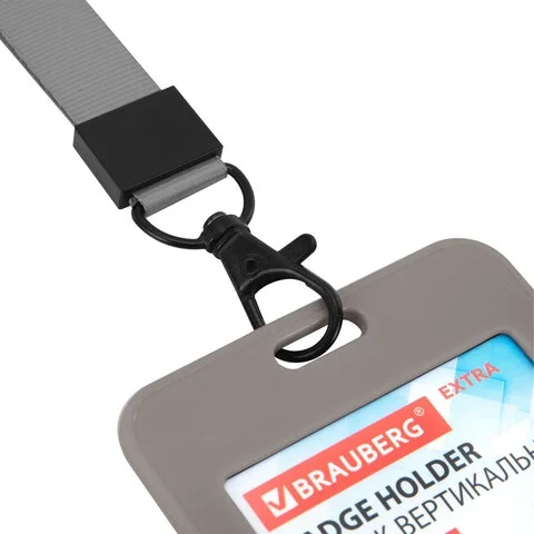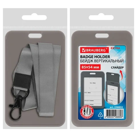 Бейдж вертикальный (85х54 мм), лента 45 см с карабином, СЛАЙДЕР, серый, BRAUBERG EXTRA, 238832