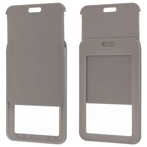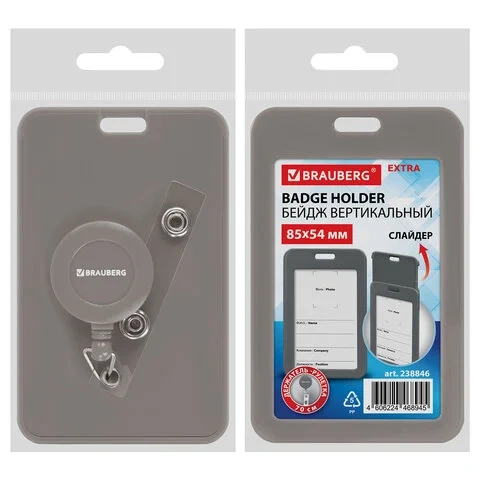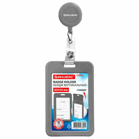 Бейдж вертикальный (85х54 мм), с рулеткой 70 см с клипом, СЛАЙДЕР, серый, BRAUBERG EXTRA, 238846